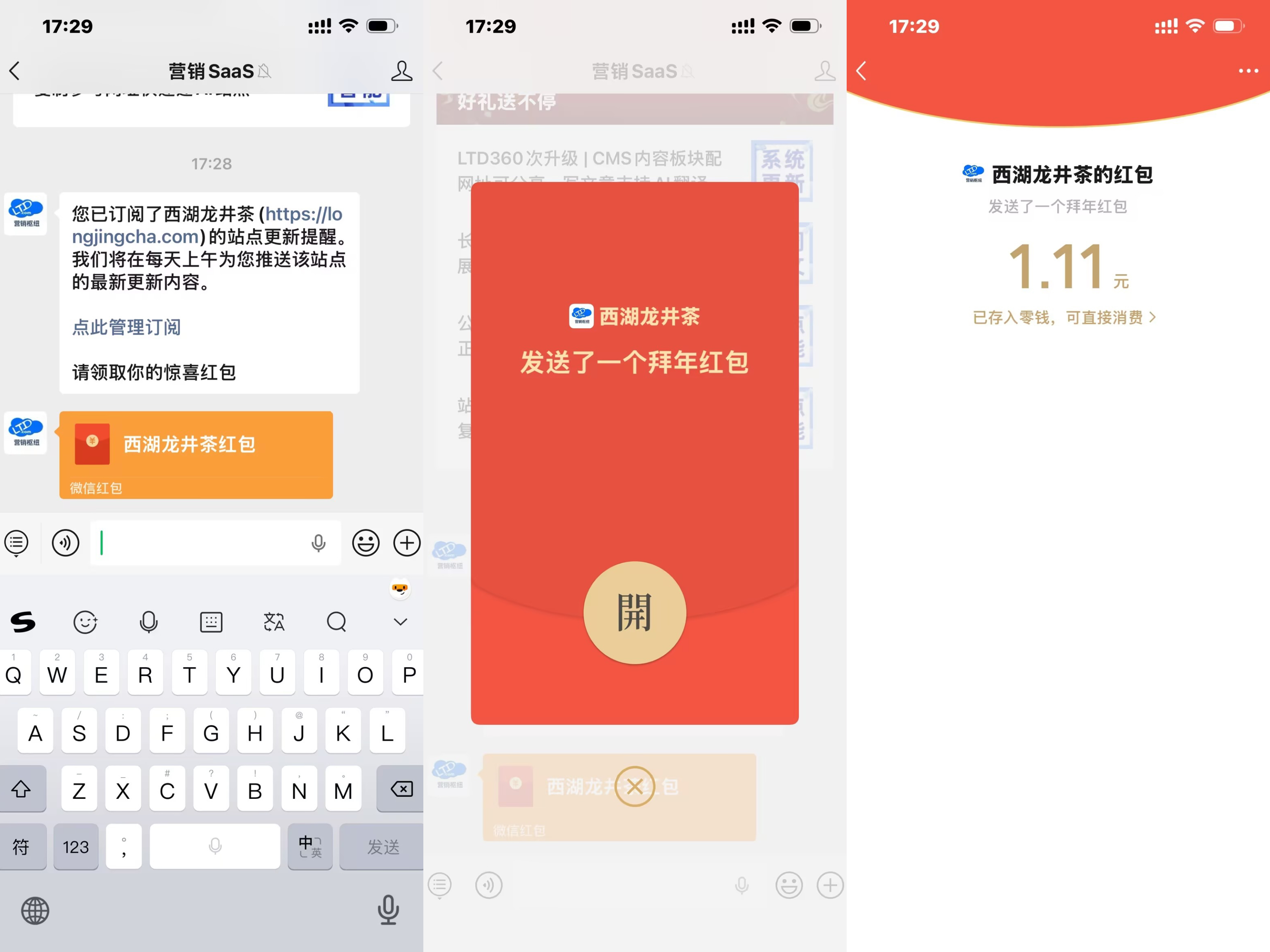 使用微信扫描二维码,关注西湖龙井茶官方公众号。关注后,系统将自动发送拜年红包,点击即可领取,将直接存入微信零钱。
