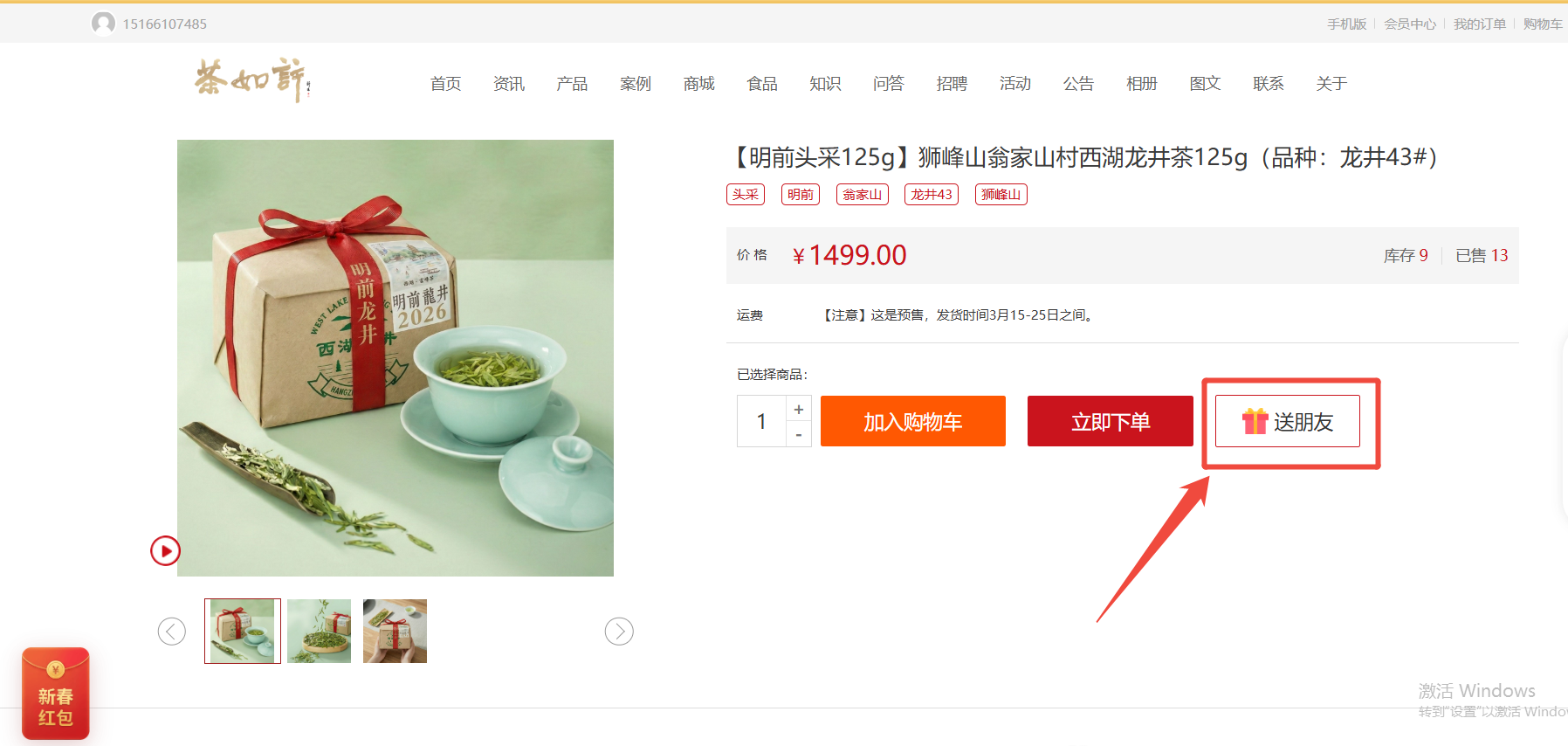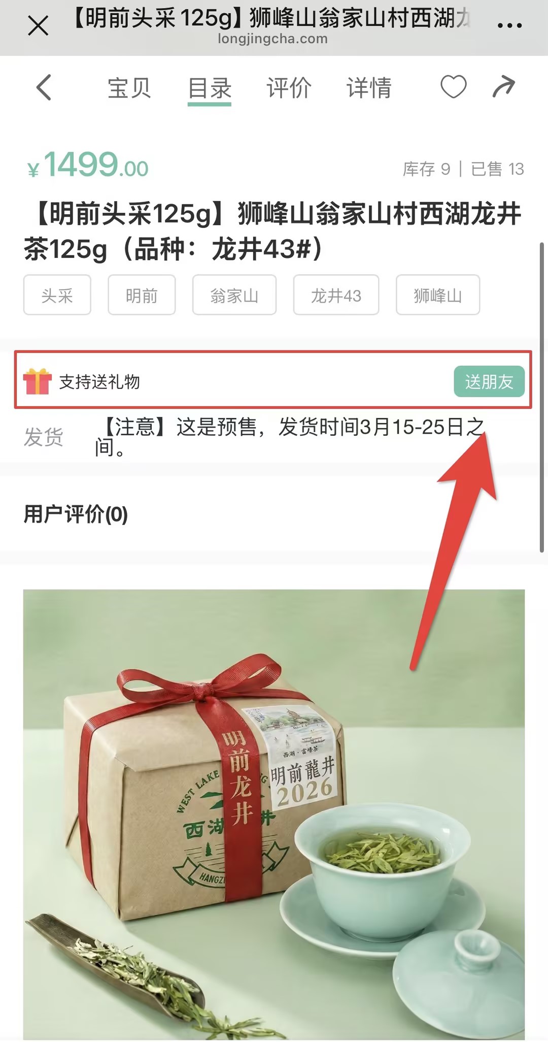 无论您是使用电脑端浏览还是手机端,在您心仪的茶品(如图所示狮峰明前头采)详情页,您都能在“立即下单”旁找到新增的【送朋友】专属按钮。