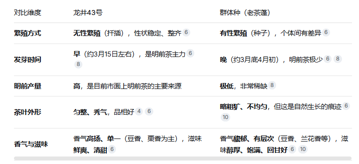 所以,当你把这两个问题合起来看,脉络就很清晰了:龙井43号的出现,让明前茶从过去的稀缺品,变成了现在的市场主流。而那句老话所指的 “明前龙井” ,其实是特指发芽晚、产量少、但风味绝佳的 “群体种” 。