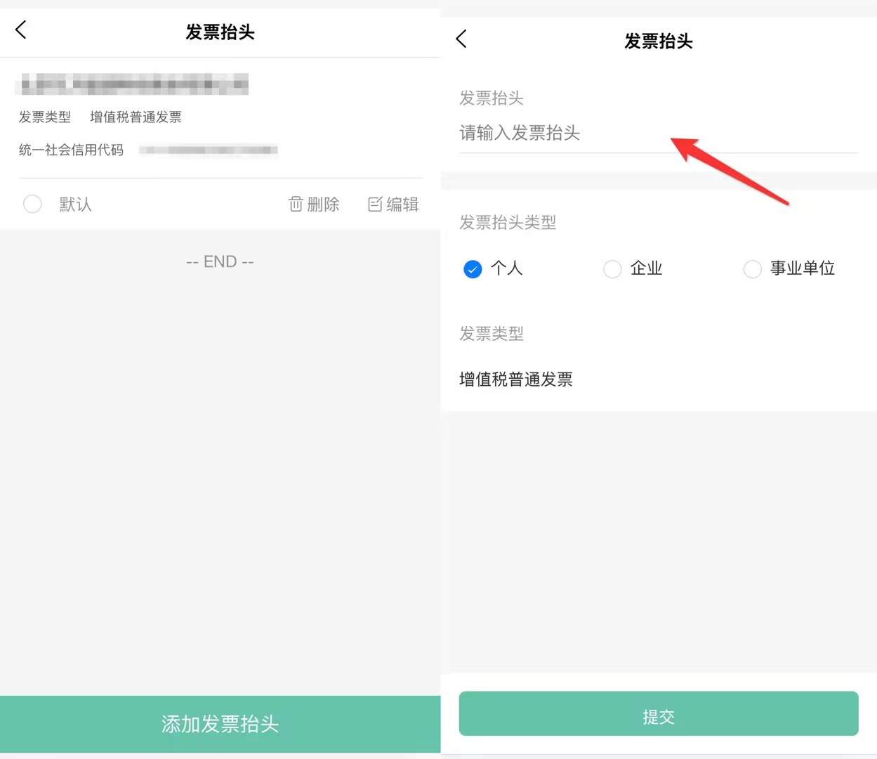 若需新增,请点击底部“添加发票抬头”。根据您的实际需求,选择发票抬头类型(个人、企业或事业单位)。企业用户请准确输入抬头名称及统一社会信用代码。