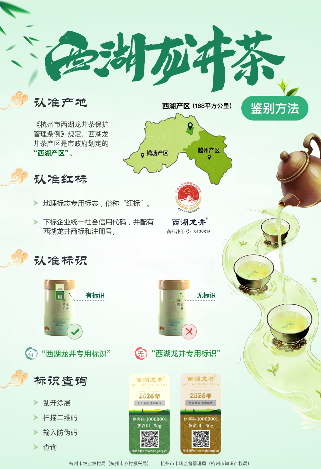 消费者在购买西湖龙井茶后,刮开西湖龙井茶防伪溯源专用标识上的防伪涂层,扫描二维码并输入防伪码,即可实现追溯。