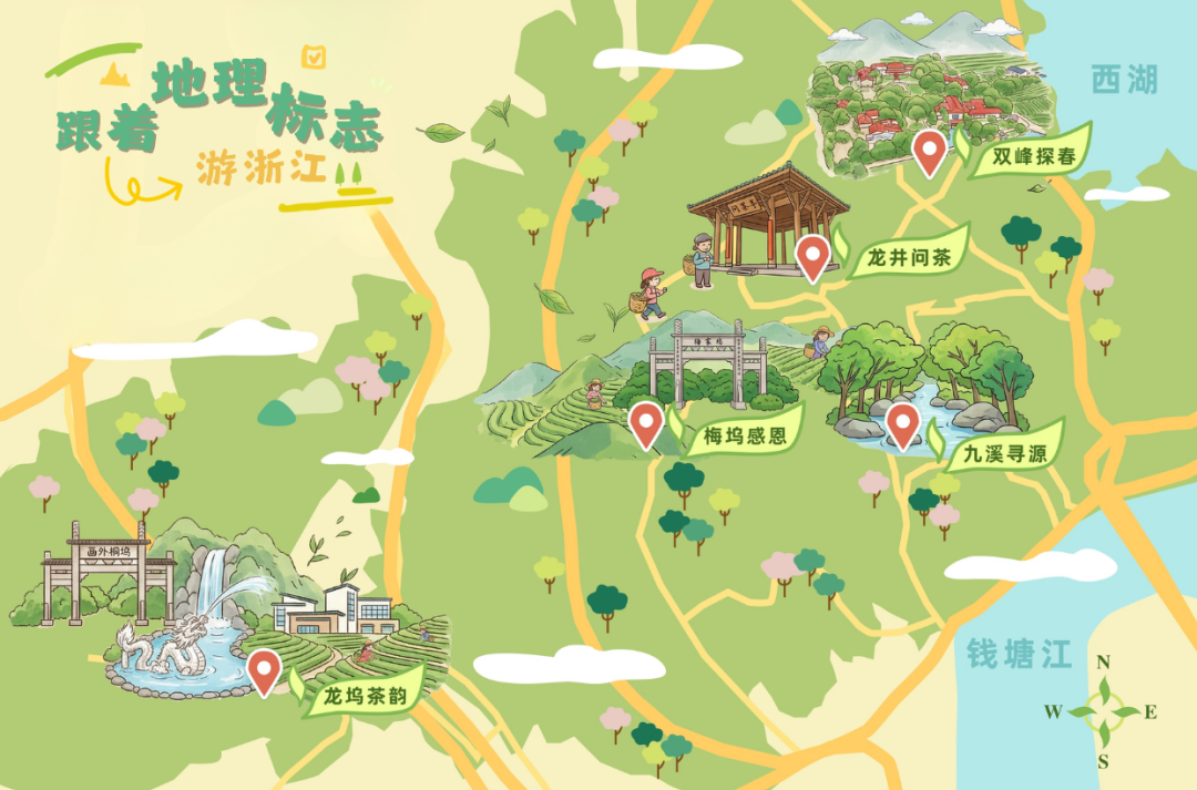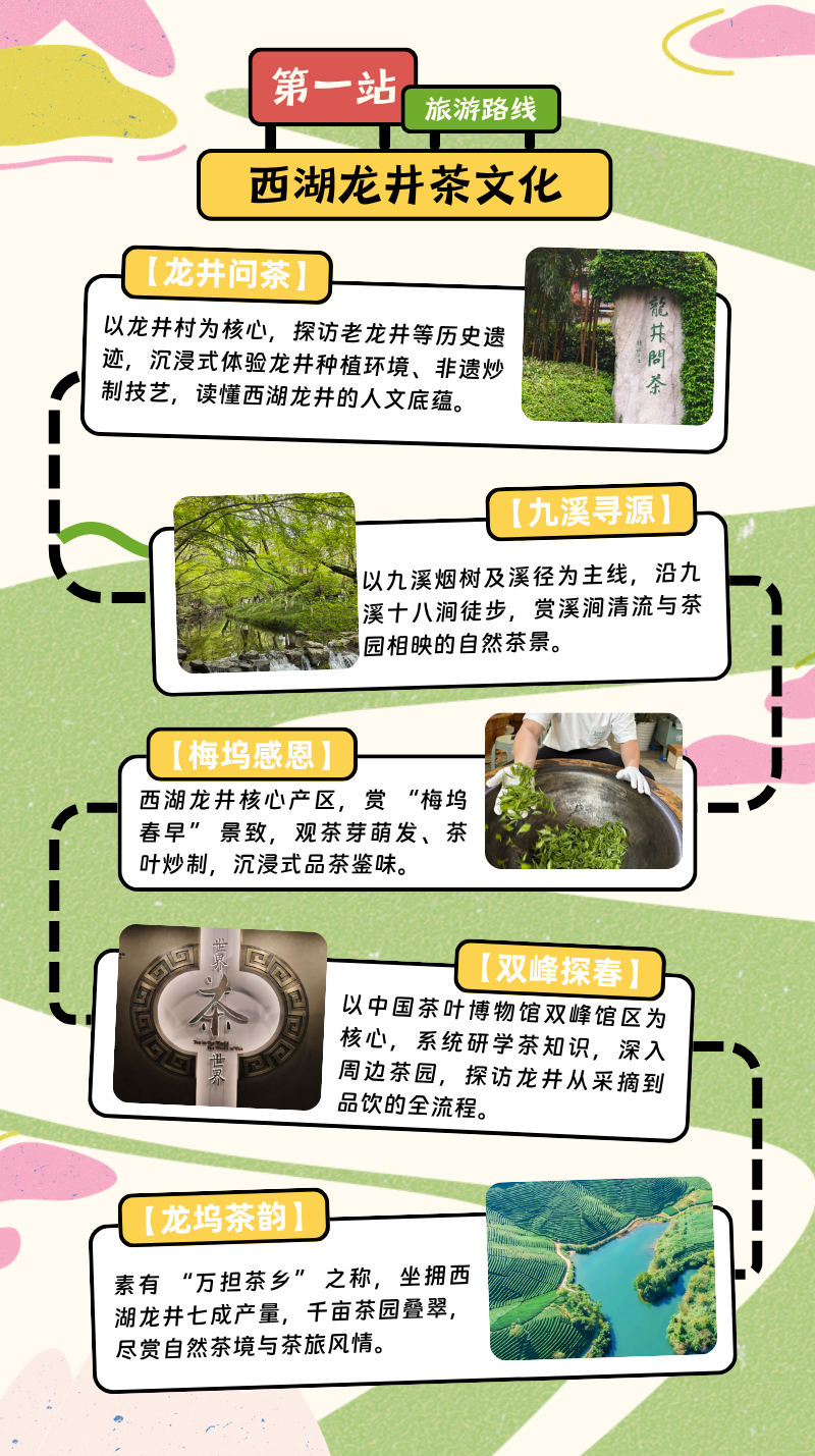 “龙井问茶”“九溪寻源”“梅坞感恩”“双峰探春”“龙坞茶韵”是杭州为推广茶文化、促进产业融合而重点打造的西湖龙井茶文化旅游线路。