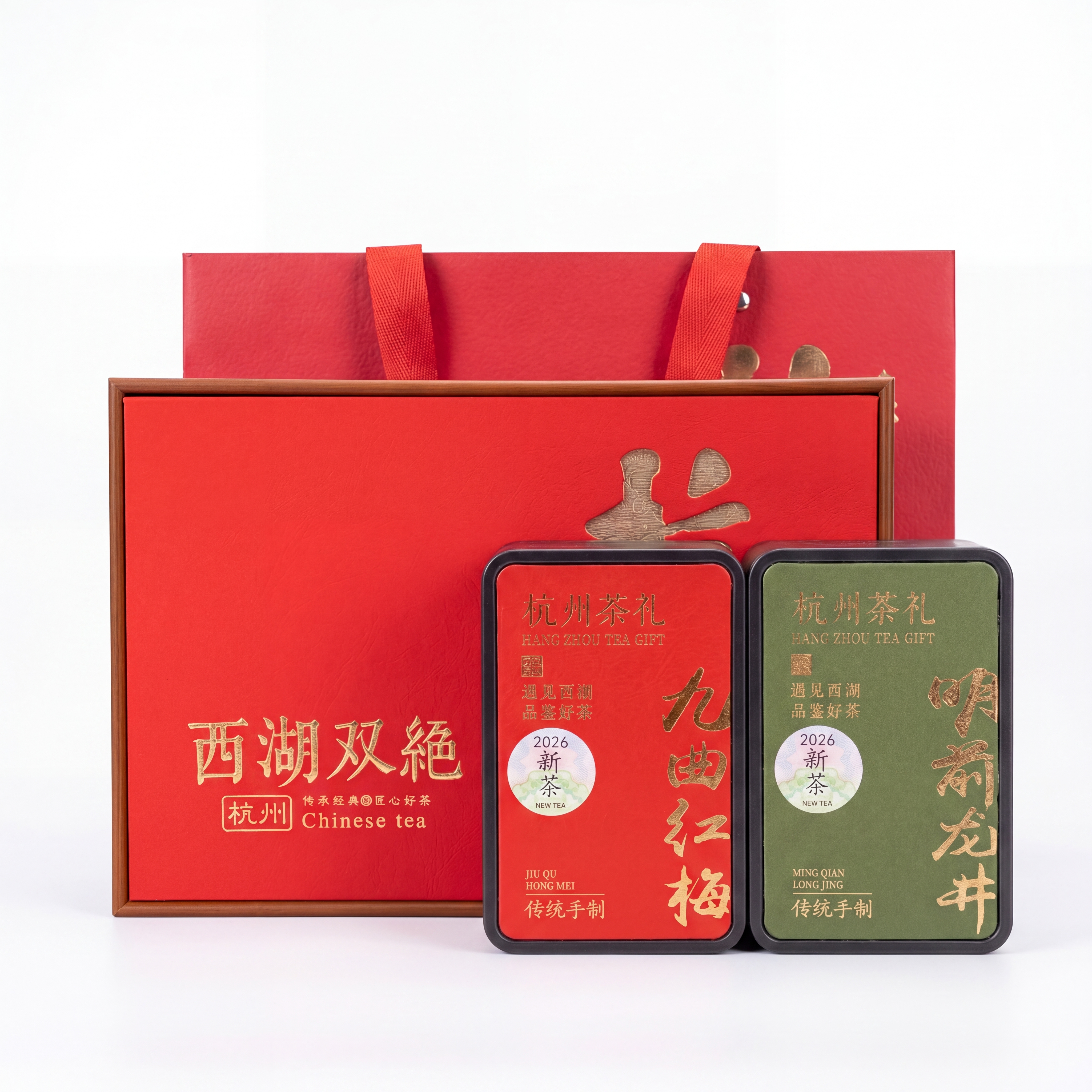 (九曲红梅+西湖龙井双拼礼盒装200g) 一盒尽揽“西湖双绝”,让您在绿茶的鲜爽与红茶的醇和之间随心切换。